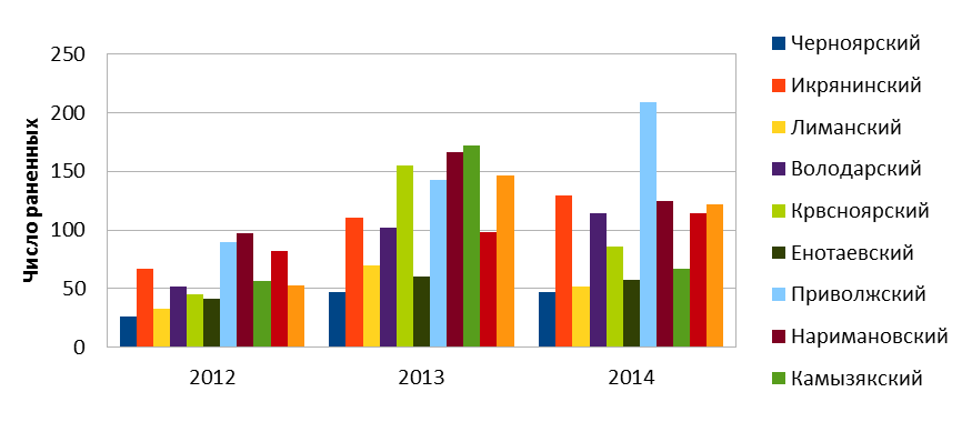 Рисунок 1.2 Число раненных в Астраханской области за три года.