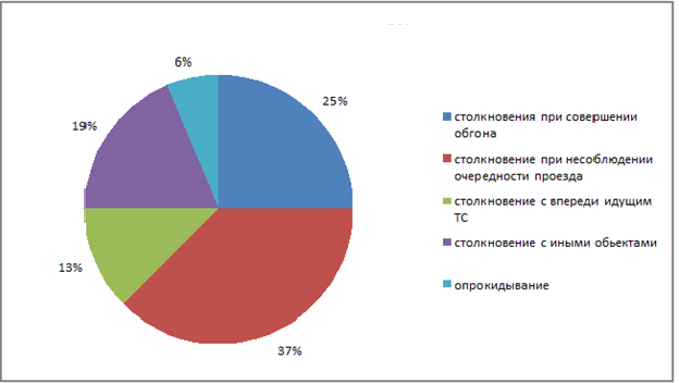По данной диаграмме мы видим, что из всех видов ДТП наиболее частыми являются столкновение транспортных средств. Это связано с неразделенными транспортными потоками, а так же несоблюдением правил дорожного движения.