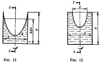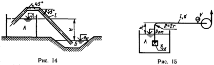 Задача 6 (рис.10). Круглое отверстие между двумя резервуарами закрыто конической крышкой с размерами D и L. Закрытый резервуар заполнен водой, а открытый – жидкостью Ж. К закрытому резервуару сверху присоединен мановакуумметр МV, показывающий манометрическое давление р м или вакуум р в. Температура жидкостей 20°С, глубины h и H. Определить силу, срезывающую болты А, и горизонтальную силу, действующую на крышку. Силой тяжести крышки пренебречь. Векторы сил показать на схеме. Задача 7 (рис.11). Цилиндрическая цистерна наполнена бензином, температура которого 20°С. Диаметр цистерны D, длина L. Глубина бензина в горловине h = 20 см, ее диаметр d = 30 см. Определить силы давления на плоские торцевые стенки А и В цистерны в двух случаях: 1) когда цистерна не движется; 2) при движении цистерны горизонтально с положительным ускорением а. Задача 8 (рис.12). Открытый цилиндрический резервуар заполнен жидкостью Ж до высоты 0, 8 H. Диаметр резервуара D, температура жидкости 20°С. Определить: 1) объем жидкости, сливающейся из резервуара при его вращении с частотой n вокруг его вертикальной оси; 2) силу давления на дно резервуара и горизонтальную силу, разрывающую резервуар по сечению 1 – 1 при его вращении. Задача 9 (рис.13). Цилиндрический сосуд диаметром D и высотой Н полностью заполнен водой, температура которой 20°С. Диаметр отверстия сверху равен d. Определить: 1) с какой предельной частотой можно вращать сосуд около его вертикальной оси, чтобы в сосуде осталось 75% первоначального объема воды; 2) силу давления на дно сосуда и горизонтальную силу, разрывающую сосуд по сечению 1 – 1 при его вращении с определенной частотой. Задача 10 (рис.14). По сифонному трубопроводу длиной l жидкость Ж при температуре 20°С сбрасывается из отстойника А в отводящий канал Б. Какой должен быть диаметр d трубопровода (его эквивалентная шероховатость Dэ), чтобы обеспечить сбрасывание жидкости в количестве Q при напоре H? Трубопровод снабжен приемным клапаном с сеткой (zк), а плавные повороты имеют углы 45° и радиус округления R = 2 r. Построить пьезометрическую и напорную линии. Данные в соответствии с вариантом задания выбрать из табл.4.