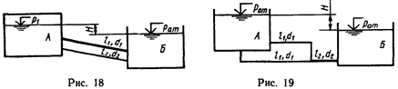 Задача 11 (рис.15). Центробежный насос, перекачивающий жидкость Ж при температуре 20°С, развивает подачу Q. Определить допустимую высоту всасывания h в, если длина всасывающего трубопровода l, диаметр d, эквивалентная шероховатость Dэ, коэффициент сопротивления обратного клапана zк, а показание вакуумметра не превышало бы р 1. Построить пьезометрическую и напорную линии. Данные в соответствии с вариантом задания выбрать из табл.4. Задача 12 (рис.16). В баке А жидкость подогревается до температуры 50°С и самотеком по трубопроводу длиной l 1 попадает в производственный цех. Напор в баке А равен Н. Каким должен быть диаметр трубопровода, чтобы обеспечивалась подача жидкости в количестве Q при манометрическом давлении в конце трубопровода не ниже р м? Построить пьезометрическую и напорную линии. Данные для решения задачи в соответствии с вариантом задания выбрать из табл.4. Задача 13 (рис.17). Из большого закрытого резервуара А, в котором поддерживается постоянный уровень жидкости, а давление на поверхности жидкости равно р 1, по трубопроводу, состоящему из двух последовательно соединенных труб, жидкость Ж при температуре 20°С течет в открытый резервуар Б. Разность уровней жидкости в резервуарах равна Н. Длина труб l 1 и l 2, диаметры d 1 и d 2, а эквивалентная шероховатость Dэ. Определить расход Q жидкости, протекающей по трубопроводу. В расчетах принять, что местные потери напора составляют 20% от потерь по длине. Данные для решения задачи в соответствии с вариантом задания выбрать из табл.4. Задача 14 (рис.18). Из большого закрытого резервуара А, в котором поддерживается постоянный уровень жидкости, а давление на поверхности ее равно p 1, по трубопроводу, состоящему из двух параллельно соединенных труб одинаковой длины l 1 но разных диаметров d 1 и d 2 (эквивалентная шероховатость Dэ), жидкость Ж при температуре 50°С течет в открытый резервуар Б. Разность уровней жидкости в резервуарах равна Н. Определить расход Q жидкости, протекающей в резервуар Б. В расчетах принять, что местные потери напора составляют 20% от потерь по длине. Данные для решения задачи в соответствии с вариантом задания выбрать из табл.4. Задача 15 (рис.19). Из большого резервуара А, в котором поддерживается постоянный уровень жидкости, по трубопроводу, состоящему из трех труб, длина которых l 1 и l 2, диаметры d 1 и d 2, а эквивалентная шероховатость Dэ, жидкость Ж