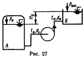 При построении характеристики насосной установки из местных гидравлических сопротивлений учесть плавные повороты труб с радиусами R = 2 d, сопротивление задвижки с коэффициентом местного сопротивления zз и вход в резервуар. Найти рабочую точку при работе насоса на сеть. Определить, как изменяются напор и мощность насоса при уменьшении задвижкой подачи воды на 20%. Задача 23 (рис.27). Центробежный насос, характеристика которого задана в условии (табл.3), работает в системе, перекачивая воду, температура которой T = 40°С,