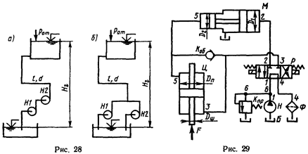 Задача 25 (рис.29). В установке гидравлического пресса насос Н засасывает рабочую жидкость – масло Ж, температура которого 55°С, из бака Б и через трехпозиционный распределить Р нагнетает ее в пресс. При прессовании по трубопроводу 2 жидкость подается в правую сторону мультипликатора М. При возвращении подвижного инструмента пресса в исходное верхнее положение жидкость подается по трубопроводу 3 в рабочий гидроцилиндр Ц. При движении поршня гидроцилиндра вверх через трубопровод 5 мультипликатор М заправляется. Объемные потери жидкости при этом компенсируются насосом через обратный клапан К об.
