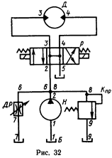 Задача 26 (рис.30). Насос Н гидросистемы продольной подачи рабочего стола металлорежущего станка нагнетает рабочую жидкость – масло Ж, температура которой Т °С, через распределитель Р в силовой гидроцилиндр Ц, шток которого нагружен силой F. Диаметр поршня гидроцилиндра D п, штока D ш. К.п.д. гидроцилиндра: механический Определить скорость перемещения рабочего стола вправо (I позиция распределителя Р), если характеристика насоса с переливным клапаном Q н = f (р н) задана: Q м, л/с 0, 00 1, 50 1, 65 p м, МПа 4, 00 3, 00 0, 00 Задача 27 (рис.31). В гидроприводе вращательного движения рабочая жидкость – масло Ж, температура которого Т °С, из бака Б нагнетается регулируемым насосом Н через распределитель Р в гидромотор. Рабочий объем гидромотора V 0, а частота вращения n. К.п.д. гидромотора: объемный Номинальные потери в распределителе при номинальном расходе Q ном составляют D p ном = 250 КПа. Длина каждого из участков стальных гидролиний равна l, диаметры всех линий равны d. Эквивалентная шероховатость Dэ = 0, 075 мм. Местные сопротивления в гидросистеме, кроме распределителя, принять в плавных поворотах гидролиний и в штуцерных их присоединениях. Коэффициент сопротивления одного штуцера принять равным zш = 0, 60. Определить необходимую подачу насоса и к.п.д. гидропривода, если к.п.д. насоса равен hн. Задача 28 (рис.32). Насос Н нагнетает рабочую жидкость – масло Ж, температура которой Т = 55 °С, через распределитель Р в гидродвигатель Д, вал