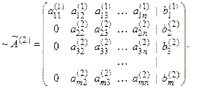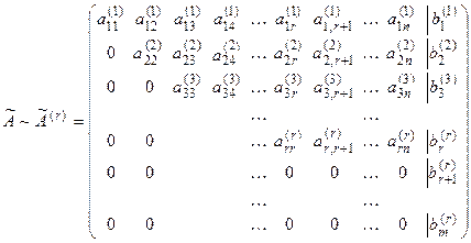 В результате, получим матрицу, в которой во втором столбце под главной диагональю все элементы равны нулю. Будем выполнять указанные преобразования до тех пор, пока матрица системы А не примет трапециевидную форму, пусть это произойдет на шаге r, т.е.