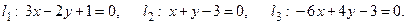 Пример 3.3. Найти расстояние от точки пересечения прямых l l и l 2 до прямой l 3. Определить взаимное расположение пар прямых l 1, l 3 и l 2, l 3, если прямые заданы общими уравнениями: