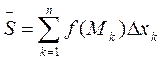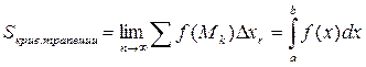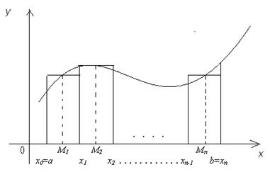 Рис.1 Решение. 1) Разобьем отрезок [ a; b ] на n частей точками x0 = a; x1; x2; xn-1; xn = b и проведем прямые x = x1, x = x2, … x = xт-1, которые разобьют трапецию на n частей. 2) Обозначим D xk = xk - xk-1 – длины отрезков разбиения [ a; b ]. На каждом их отрезков произвольно выберем точку Mk (k = 1; … n). Построим на каждом из отрезков прямоугольники с высотами, равными значению функции в выбранных точках Mk. Площади полученных прямоугольников равны: S1 = f (M1) × D x1; S2 = f (M2) × D x2; ….; Sn = f (Mn) × D xn. 3) Найдем сумму этих площадей: