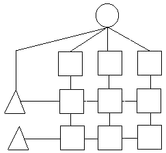 Рис. 2. Функциональная организационная структура Дивизиональная департаментизация является вариантом сложной производной от линейной и функциональной. Ее суть предполагает, во-первых, значительные по масштабам линейные подразделения, самостоятельность и автономность функционирования которых значительны, во-вторых, создание в линейных подразделениях (для обеспечения эффективной реализации прав) функциональных служб. Такой тип департаментизации вызывается диверсификацией производственной деятельности, расширением территориальных границ или структурированием потребителя фирм. В результате в рамках одной компании могут выделяться (на уровне оперативного управления), например, предприятия по выпуску то или иного продукта, географически отдаленные подразделения (филиалы) или подразделения, ориентированные на конкретного потребителя. Самым сложным типом департаментизации является матричная. По сути, она представляет собой комбинацию ранее рассмотренных, сбалансированный механизм компромисса между дифференциацией и группировкой работ вокруг ресурсов или результата деятельности. Ее условное изображение может быть следующим: