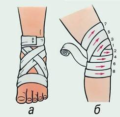 Рис. 3. Крестообразные повязки на голеностопный (а) и на коленный (б) суставы. Цифрами указана последовательность наложения туров бинтов.