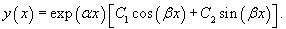 Дискриминант характеристического квадратного уравнения отрицателен: D < 0. Такое уравнение имеет комплексно-сопряженные корни k1 = α + β i, k1 = α − β i. Общее решение записывается в виде
