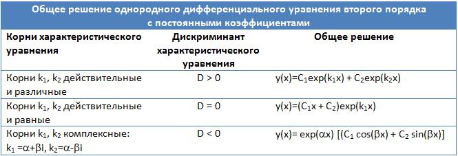 Обшее решение однородного дифференциального уравнения зависит от корней характеристического уравнения, которое в данном случае будет являться квадратным уравнением. Возможны следующие случаи: