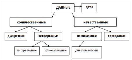 Всю совокупность данных МБИ и, как следствие, методов; их автоматизированного анализа можно разделить на; большие группы: детерминированные и статистические. Детерминированные данные имеют место в тех случаях, когда известен вид функциональной зависимости, связывающей значения исследуемых клинико-биохимических показателей. Лишь в сравнительно немногих случаях, да и то в виде первого приближения, можно считать, что реальная зависимость, связывающая некоторые исследуемые показатели биологического объекта, носит детерминированный характер. Причем, если вид функциональной зависимости определен полностью, то с информационной точки зрения он не представляет интереса для исследователя и не может выступать в качестве объекта автоматизированного анализа, так как не несет никакой новой информации. Поэтому практически речь идет о задачах, когда вид функциональной зависимости известен с точностью до некоторой совокупности параметров, получение оценок которых и является предметом анализа. В абсолютном большинстве случаев оказывается, что анализируемые показатели являются недетерминированными, статистическими. Именно такая природа данных представляет наибольший интерес и наибольшую сложность с точки зрения методов анализа, целью которых в этом случае является выявление некоторых объективных закономерностей, отражающих связь исследуемых показателей для принятия дальнейших решений. Существует большое число различных классификаций статистических данных. Представляется целесообразным выделить те из них, которые встречаются в МБИ или полезны как удобная математическая модель, достаточно адекватная исследуемому процессу. Причем, поскольку в дальнейших разделах мы более подробно остановимся на статистических моделях данных медико-биологических исследований, сейчас ограничимся лишь кратким их перечислением. По своей физической природе статистические данные могут представлять собой: 1) случайные величины X, принимающие в каждом новом опыте, проводимом в неизменных условиях, новое значение Примерами непрерывных случайных величин могут служить данные биохимического исследования, например, концентрации ферментов, аминокислот или органических кислот в биологическом материале пациентов, которые могут принимать любые случайные значения на действительной оси. Примером дискретных случайных данных медико-биологических исследований могут служить результаты клинического обследования пациента, заключающиеся в выявлении определенной совокупности клинических симптомов и признаков, регистрируемых по принципу " есть" - " нет ". То есть факт наличия/отсутствия каждого из клинических признаков может интерпретироваться с точки зрения последующего анализа как случайная величина, способная принимать два дискретных значения: 1 — если признак регистрируется в процессе обследования, и 0 - в противном случае. Существенный объем данных МБИ представляют результаты субъективной регистрации степени проявления некоторых показателей состояния биологического объекта, количественно выражаемые тестовыми баллами (типичный пример - результаты врачебного осмотра по выявлению степени проявления тех или иных клинических симптомов). Особенностью анализа такой группы данных (случайных по своей природе) является то, что для них пре