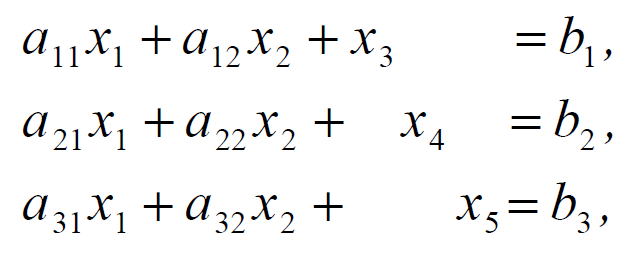 И условиях неотрицательности: xi ≥ 0, i=1, 2,..., n (3) Из системы (2) видно, что если за свободные неизвестные принять х1, х2 и положить их равными нулю, то базисные неизвестные х3, х4, х5 будут равны правым частям системы. в результате получаем план: х1=0, х2=0, х3=b1, x4=b2, x5=b3 (4) Для которого целевая функция равна