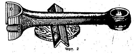 1.Взвешиванием на весах определить массу тракторного шатуна. 2.Найти центр тяжести тракторного шатуна. Для чего положить шатун на острую подставку и добиться его равновесия (черт. 2). Точка опоры соответствует положению центра тяжести. 3.Измерить расстояние
