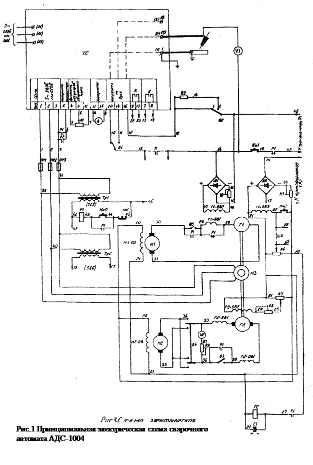 1. Сварочная головка с бункером для флюса осуществляет непрерывную подачу электродной проволоки и флюса в зону сварки. 2. Электродная проволока, предварительно уложенная в барабан, проходит через подающие ролики головки и далее через рихтующие ролики, направляющие проволоку через токопровод в зону сварки. 3. Подающие ролики приводятся во вращение электродвигателем постоянного тока с плавно регулируемое скоростью вращения через редуктор. 4. Электродная проволока сжата между двумя подающими роликами, взаимосвязанными при помощи шестерни, один из роликов укреплен на конце рычаг, усилие прижатия которого регулируется спиральной пружиной при помощи гайки. 5. Верхний ролик, предназначенный для рихтовки, может устанавливаться в положение, обеспечивающее необходимую степень выпрямления и закрепляться в этом положении гайками. 6. Токоподвод сварочной головки укреплен на цилиндрических направляющих для перемещения его в вертикальном положении. 7. Токоподвод состоит из 2-х контактных колодок: подвижной и не подвижной. Подвижная колодка прижимает электродную проволоку к неподвижной через пружины, усилие которых регулируется винтами. В соответствии с диаметром применяемой электродной проволоки к колодкам крепятся сменные вкладыши. Сварочный кабель подключается к неподвижной колодке. Для равномерного распределения тока подвижная и неподвижная колодки соединены между собой гибкой медной шиной. 8. На корпусе сварочной головки укреплен бункер 4 для флюса. К нижней части токоподвода прикреплена воронка, обеспечивающая концентрацию, относительно конца электрода, подачу флюса, поступающего из бункера. Бункер соединен с воронкой при помощи гофрированной трубки. 9. Сварочная головка укреплена на одном конце горизонтальной штанги каретки, а на другом ее конце укреплены пульт управления и барабан для электродной проволоки. 10. Сварочная головка и токоподвод с электродной проволокой могут быть повернуты в плоскости шва на угол до 45° в одну сторону от вертикали. Угол наклона головки фиксируется зубчатыми полумуфтами. 11. На пульте управления смонтированы амперметр для измерения сварочного тока, вольтметр для измерения напряжения дуги, прибор для измерения скорости сварки, потенциометры - регуляторы сварочного тока, напряжения дуги и скорости сварки, переключатель («автоматический режим», «наладочный режим»), переключатель направления движения каретки («влево», вправо») и т.д. Действие органов управления, расположенных на пульте, обозначены символами, расшифровка которых приведена на рис.9. 12. Конструкция барабана предусматривает внутреннюю намотку электродной проволоки. Выводы 1. Каким образом регулируется рабочее напряжение сварочной дуги?