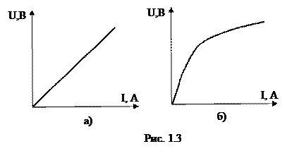 На рис. 1.1 и 1.2 показаны положительные направления напряжений UE и UJ на зажимах источников электрической энергии. В приемниках происходит преобразование электрической энергии в другие виды энергии. Все приемники электрической энергии характеризуются такой величиной как электрическое сопротивление R. В том случае, если величина сопротивления не зависит от тока и напряжения (R=const), приемники называют линейными, и их вольт-амперная характеристика (ВАХ) линейна (рис. 1.3, а). Если же величина сопротивления зависит от тока или напряжения R=f(U, I), то такие приемники имеют нелинейную ВАХ (рис. 1.3, б) и называются нелинейными.
