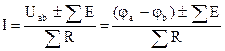 где Uab=(φ a-φ b) - напряжение на зажимах всего участка цепи направленное по току; Σ Е –алгебраическая сумма ЭДС участка цепи, в которой ЭДС берется со знаком «+», если ее направление совпадает с направлением тока, или со знаком «-», если не совпадает; В случае, если полученное в результате расчета значение тока отрицательно, это значит, что его действительное направление противоположно ранее принятому за положительное.