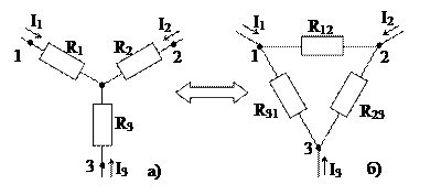Для случая параллельного соединения двух ветвей это выражение буде иметь вид: При расчете электрических цепей возникает необходимость взаимных эквивалентных преобразований звезды (рис. 1.11, а) и треугольника (рис. 1.11, б) сопротивлений. Соединения звездой и треугольником эквивалентны друг другу при условии, что при одинаковых в обоих случаях напряжениях U12, U23, U31 между точками 1, 2 и 3 и токи I1, I2, I3, подходящие к этим точкам от остальной части цепи, одинаковы в обоих случаях.