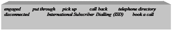 Exercise 1. Read and memorize the following words and word combinations: to inform smb/ to let smb. know — поінформувати, повідомити когось to find out — виявити (дані, інформацію) to be in / out (away, off) — бути присутнім /відсутнім to (tele)phone (ring (up), call) — телефонувати to make / give a call / ring — подзвонити receiver — телефонна трубка to lift / take up / pick up the receiver — підняти трубку the line is free — лінія вільна the line is engaged / busy — лінія зайнята to connect / to put a call through — з'єднувати абонентів to disconnect/ to clear — роз'єднувати абонентів coin-box telephone / telephone booth/ box phone -телефон-автомат trunk-call / long distance call (Am.) — міжміський телефонний виклик digit — цифра to dial the number — набрати номер dialling tone — тривалий гудок rapid pip — короткий гудок to spell smth. — назвати по буквах subscriber — абонент International Subscriber Dialling (ISD) — міжнародний автоматичний телефонний зв'язок Subscriber Trunk Dialling (STD) — міжміський автоматичний телефонний зв'язок The city is not on STD. — Із містом нема автоматичного телефонного зв'язку. Telephone Directory / Book — телефонний довідник a touch-tone phone — телефон з тоновим нa6oром a collect call (Am)/ transferred charge call (GB) — дзвінок за рахунок абонента to hold on – чекати на лінії to call back – передзвонювати to trouble, to bother – турбувати to book a call to /to place a call – замовити дзвінок.