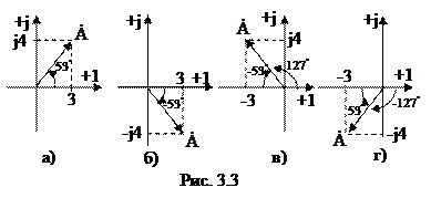 Решение. Для наглядности при переводе из алгебраической формы записи комплексного числа в показательную удобно сопровождать вычисления построением векторов на комплексной плоскости. Необходимо помнить, что во всех случаях, когда действительная часть комплексного числа отрицательна, то при определении начальной фазы необходимо прибавить или отнять 180°. а) б) в) г) Вектора, соответствующие рассматриваемым комплексным величинам, построены на рис. 3.3. Пример. Определить мгновенное значение тока i3(t) в схеме рис. 3.4, а, если