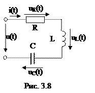 Пусть в цепи, состоящей из последовательно соединенных элементов R, L, C (рис. 3.8), известен ток i(t)=Imsin(ω t +ψ i) и необходимо определить напряжение на ее зажимах. Запишем для цепи уравнение по второму закону Кирхгофа для мгновенных значений напря-жений: