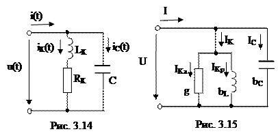 На рис. 3.14 представлена схема параллельного соединения реальной индуктивной катушки с параметрами LК, RК и идеального конденсатора с емкостью С. Для действующих комплексных значений токов на основании первого закона Кирхгофа запишем: