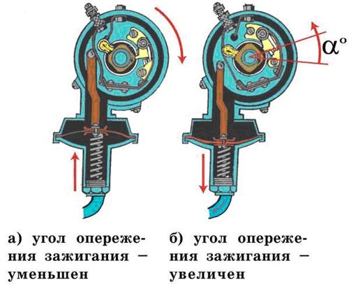 Источники электрического тока (аккумуляторная батарея и генератор, подробный разговор о которых будет в разделе " Электрооборудование автомобиля") вырабатывают ток низкого напряжения. Они " выдают" в бортовую электрическую сеть автомобиля 12-14 вольт. Для возникновения искры между электродами свечи на них необходимо подать 18-20 тысяч вольт! Поэтому в системе зажигания имеются две электрические цепи - низкого и высокого напряжения (рис. 21). Контактная система зажигания состоит из (рис. 21): Катушка зажигания (рис. 21) предназначена для преобразования тока низкого напряжения в ток высокого напряжения. Как и большинство приборов системы зажигания, она располагается в моторном отсеке автомобиля. а) электрическая цепь низкого напряжения: 1 - " масса" автомобиля; 2 - аккумуляторная батарея; 3 - контакты замка зажигания; 4 - катушка зажигания; 5 - первичная обмотка (низкого напряжения); 6 - конденсатор; 7 - подвижный контакт прерывателя; 8 - неподвижный контакт прерывателя; 9 - кулачок прерывателя; 10 - молоточек контактов б) электрическая цепь высокого напряжения: 1 - катушка зажигания; 2 - вторичная обмотка (высокого напряжения); 3 - высоковольтный провод катушки зажигания; 4 - крышка распределителя тока высокого напряжения; 5 - высоковольтные провода свечей зажигания; 6 - свечи зажигания; 7 - распределитель тока высокого напряжения (" бегунок"); 8 - резистор; 9 - центральный контакт распределителя; 10 - боковые контакты крышки Рис. 21. Контактная система зажигания Принцип работы катушки зажигания очень прост и знаком из школьного курса физики. Когда по обмотке низкого напряжения протекает электрический ток, вокруг нее создается магнитное поле. Если прервать ток в этой обмотке, то исчезающее магнитное поле индуцирует ток уже в другой обмотке (высокого напряжения). За счет разницы в количестве витков обмоток катушки, из 12-ти вольт мы получаем необходимые нам 20 тысяч вольт! Цифра весьма впечатляющая, но это как раз то напряжение, которое в состоянии пробить воздушное пространство (около миллиметра) между электродами свечи зажигания. Если кто из вас, испугавшись этой цифры, решил вообще не дотрагиваться до чего-либо электрического в машине, то напрасно. " Убивает не напряжение, а ток" - известное выражение у электриков, как нельзя лучше подходит к ситуации с электричеством в автомобиле. В системе зажигания очень малые токи, поэтому, если вы и дотронетесь до проводов или приборов системы, то будет лишь несколько " неприятно", но не более того. Да и произойдет это только, если вы стоите босиком (или в мокрой обуви) на сырой земле или если одна рука на " массе", а другая на тех самых 20000 В. Прерыватель тока низкого напряжения (контакты прерывателя - рис. 21) нужен для того, чтобы размыкать ток в цепи низкого напряжения. При этом во вторичной обмотке катушки зажигания индуцируется ток высокого напряжения, который затем поступает на центральный контакт распределителя. Контакты прерывателя находятся под крышкой распределителя зажигания. Пластинчатая пружина подвижного контакта постоянно прижимает его к неподвижному контакту. Размыкаются они лишь на короткий срок, когда набегающий кулачок приводного валика прерывателя-распределителя надавит на молоточек подвижного контакта. Параллельно контактам включен конденсатор, который необходим для того, чтобы контакты не обгорали в мо