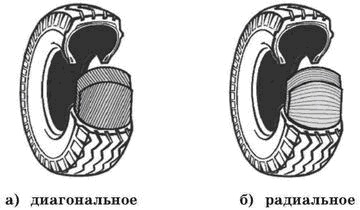 В камерной шине находится резиновая камера, которая заполняется воздухом. Шина без камеры раньше называлась покрышкой. Шина состоит из каркаса (корда) и протектора, а также боковин и бортов (рис. 49). Рис. 49. Колесо легкового автомобиля: 1 - диск колеса; 2 - обод; 3 - борт; 4 - камера; 5 - боковина; 6 - корд; 7 - протектор Каркас шины является главной несущей частью, ее силовой основой. Он выполняется из нескольких слоев специальной ткани - корда. Корд воспринимает давление сжатого воздуха изнутри и нагрузки от дороги снаружи. Материалом нитей корда могут служить: хлопок, вискоза, капрон, нейлон, металлическая проволока, стекловолокно и другие материалы. Протектор - это толстый слой резины с определенным рисунком, который расположен на наружной поверхности покрышки и непосредственно соприкасается с поверхностью дороги. Рисунок протектора может быть дорожным, универсальным и специальным. Выбор покрышки с тем или иным рисунком протектора зависит от предполагаемых условий эксплуатации автомобиля. Каждый человек меняет обувь в зависимости от сезона. Если туфли на высоком каблуке идеальны для сухого асфальта или паркета, то в них абсолютно невозможно передвигаться по грязи, мокрому снегу или льду. А шины, это обувь вашего автомобиля, и если вы подбираете рисунок протектора в зависимости от условий эксплуатации, то поступаете очень мудро. Это повышает безопасность движения вашего автомобиля, а также обеспечивает безопасность других участников дорожного движения. Разглядывая " зимнюю" покрышку, обратите внимание на рисунок протектора - он может быть " направленным". Это означает, что такая покрышка должна вращаться по направлению стрелки, нанесенной на ее боковине. При этом покрышка устанавливается только на правую сторону автомобиля или только на левую. Перестановка колес с направленным рисунком протектора шин с одной стороны машины на другую не допускается! В бескамерной шине отсутствует, и не предусмотрена, резиновая камера для воздуха. Полость, заключенная между покрышкой и ободом, должна быть герметичной, так как непосредственно она и заполняется воздухом. Поэтому диск для бескамерной шины отличается от обычного диска наличием уплотняющих буртиков на ободе (рис. 49 б). При покупке дисков на это следует обращать внимание. Если вы используете шины с камерой, то подойдут любые диски, буртики вам не помешают. Шины бывают с диагональным и радиальным расположением нитей корда, в зависимости от конструкции каркаса. В диагональных шинах (рис. 50 а) нити корда располагаются перекрестно под углом 35-38° и соединяют боковины покрышки по диагонали. На легковых автомобилях такие шины уже не применяются. В радиальных шинах (рис. 50 б) нити корда расположены по отношению к бортам почти под прямым углом. Основными достоинствами радиальных шин являются: хорошее сцепление с дорогой, малое сопротивление качению и большой срок службы. Они более эластичны, чем диагональные, поэтому поездка на автомобиле становится более комфортной и безопасной. В тоже время, при небрежном отношении к радиальным шинам срок их службы может снизиться до первого наезда на бордюрный камень (ввиду слабых по прочности боковин таких шин).