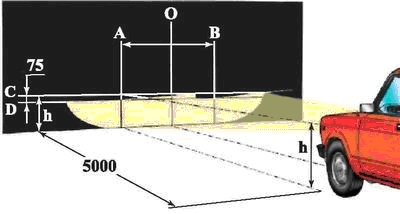 Рис. 68. Регулировка света фар: А и В - вертикальные линии, обозначающие расположение ламп ближнего света фар; С - горизонтальная линия, обозначающая расположение ламп ближнего света фар; D - линия, обозначающая высоту подъема горизонтальной границы пучков света; О - ось автомобиля; h - расстояние от поверхности площадки до ламп ближнего света фар Хорошо тем, у кого в автомобиле есть гидрокорректор фар. Водитель имеет возможность, не выходя из машины, с помощью ручки управления корректором изменить вертикальный угол наклона пучка света фар. Это необходимо делать в тех случаях, когда меняется загруженность автомобиля. Если вы положили в багажник тяжелый груз, то, естественно, задняя часть автомобиля присядет, а передняя вместе с фарами приподнимется. В результате продольного наклона машины вы плохо видите ночную дорогу, а встречные водители ослепляются даже ближним светом " задранных" вверх фар. Независимо от наличия или отсутствия корректора, при изменении загруженности автомобиля и соответствующем изменении наклона фар, обязательно отрегулируйте их, если вам предстоит ночная поездка. Иначе эта поездка может закончиться не так, как вы хотели. При необходимости замены ламп фар и прочих лампочек, это должен уметь делать сам водитель. Не мешает знать, что, меняя галогенную лампу, следует работать в перчатках. Нельзя браться голой рукой за стеклянную колбу, так как жирные следы от пальцев выведут лампу из строя. Прежде чем менять не горящую лампу, сначала стоит проверить предохранитель, защищающий электрическую цепь, в которую она включена. Если вы поставили новый предохранитель и при включении потребителя он сразу же вышел из строя, то не пытайтесь продолжать эксперимент. Найдите сами или с помощью специалиста причину короткого замыкания в цепи, в противном случае недалеко и до пожара. Обращайте внимание на маркировку предохранителей. Как правило, это 8 и 16 ампер, но могут быть и другие, особенно в автомобилях последних лет выпуска. Для того чтобы не путаться можно взять инструкцию к автомобилю выписать на бумажку место расположения предохранителей, их номиналы и приклеить эту памятку на внутреннюю сторону крышки блока предохранителей (если это не было сделано на заводе). И, простите за банальность, в автомобильной электрической сети, как и в любой другой - применение " жучков" недопустимо! Часто причиной отказа в работе ламп и прочих потребителей электрического тока является окисление и коррозия контактов, связанных с " массой" автомобиля, и реже с плюсовым проводом. Это происходит потому, что в условиях города зимняя дорожная каша попадает на электрические разъемы и интенсивно их разъедает. Что поделаешь, так о нас, об автомобилистах, " заботятся" соответствующие городские службы! А мы в ответ берем мелкозернистую шкурку, надфиль и паяльник - зачищаем, подпаиваем и, назло всем, продолжаем ездить. Если вы знакомы с электричеством и умеете " читать" схемы, то, может быть, вам удастся " прозвонить" поврежденную цепь и определить место ее обрыва. Но в обширной паутине электрической сети автомобиля это бывает не очень легко сделать. Случается, водитель узнает о том, что звуковой сигнал его автомобиля не работает в самый критический момент. Мало того, что с неработающим звуковым сигналом эксплуатация автомобиля запрещена, водитель еще и н