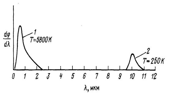 1– Кү ндер қ ысқ а толқ ынды шығ арулары бө лу; 2 - Жерлер ұ зын толқ ынды шығ арулары бө лу 1.11 сурет - Спектрлік бө лу қ ысқ а толқ ынды жә не Ұ зын толқ ынды шығ аруларды
