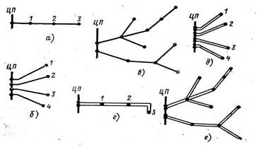 Рис. 1. Схемы разомкнутых сетей: а, б, в — магистральная, радиальная и радиально-магистральная нерезервированные; г, д, е — магистральная, радиальная и радиально-магистральная резервированные