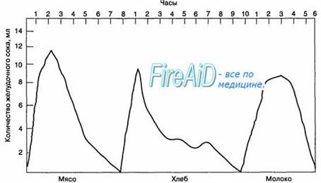91. Анализ типичных кривых желудочной секреции на хлеб, мясо и молоко.Приспособительный характер желудочной секреции к разным видам пищи. Адаптация секреторного аппарата желудка к характеру пищи обусловлена ее качеством, количеством, режимом питания. Классическим примером приспособительных реакций желудочных желез является изученная И. П. Павловым реакция пищеварительных желез в ответ на прием пищи, содержащей преимущественно углеводы (хлеб), белки (мясо), жиры (молоко). Количество отделяющегося желудочного сока, его кислотность и протеолитическая активность зависят также от количества и консистенции принятой пищи. По мере увеличения объема пищи секреция желудочного сока. Полученные кривые - кривые секреции желудочного сока. В эксперименте - 3 группы животных, которых кормили: 1-я группа: нежирное мясо - источник белков; 2-я группа: хлеб - источник углеводов; 3-я группа: нежирное молоко - смешанная пища. На мясо - выделилось наибольшее количество желудочного сока, максимальная секреция - к концу 2-го часа, сок имеет самую высокую кислотность, время секреции 7-9 ч. На хлеб - меньше желудочного сока, максимальная секреция к концу 1-го часа, менее кислая реакция, время секреции 10-12 ч. На молоко - наименьшее количество сока, слабо-кислая реакция, максимальная секреция к концу 3-го часа, время секреции 6-7 ч. На белки животного происхождения выделяется больше желудочного сока с более высокой кислотностью, чем на растительные белки. Больше всего сока - на жирную пищу.