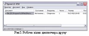 Як наголошувалося раніше, в Windows одночасно можуть працювати декілька програм. І всі вони можуть одночасно почати друкувати. Природно, в цьому випадку принтер не зможе нічого надрукувати. Крім того, програми можуть відправляти документи на друк значно швидше, ніж принтер зможе їх надрукувати. Бажано організувати чергу із завдань на друк. Для вирішення цих проблем кожна програма працює не безпосередньо з принтером, а через диспетчер друку. Основне завдання диспетчера - здійснювати черговість друку різних документів. Коли друк запущений, на панелі завдань Windows з'являється значок ^, що показує, що запущений диспетчер друку. Якщо двічі клацнути мишею на цьому значку, то відкриється робоче вікно диспетчера друку (Мал. 5). Також відкрити вікно можна за допомогою подвійного клацання на значку принтера в папці Принтери і факси (Printers and Faxes). У заголовку вікна написано ім'я використовуваного принтера. Всі документи, які були відправлені на друк, представлені в робочому вікні у вигляді таблиці. Кожен документ займає рядок таблиці, і в цьому рядку містяться ім'я документа, стан документа (постановка в чергу, друк і так далі), загальна кількість сторінок документа, число надрукованих сторінок, розмір, час і дата відправки документа на друк. Під час роботи принтера ви можете управляти ним, наприклад, припиняти і відновлювати друк, видаляти документи з черги і так далі. Дії над всіма документами в черзі друку здійснюються за допомогою команди меню Принтер (Printer). Команда в цьому меню Настройка друку (Printing preferences) дозволить налаштувати параметри принтера, про що розповідалося вище. Команда Використовувати за умовчанням (Set As Default Printer) встановить використання за умовчанням даного принтера у всіх програмах. Вибравши команду Припинити друк (Pause Printing), ви тимчасово забороните друк на цьому принтері. Повторний вибір команди вирішить друк. Команда Очистити чергу друку (Cancel All Documents) видалить всі завдання, поставлені в чергу до даного принтера. Окрім управління всією чергою, можна управляти кожним документом в черзі окремо. Слід вибрати який-небудь документ в черзі, клацнувши на нім правою кнопкою миші. При цьому з'явиться допоміжне меню, що дозволяє управляти друком вибраного документа. Ви можете зробити паузу у пресі документа, відновити друк, повторити друк спочатку, а також відмінити друк. Крім того, команда допоміжного меню Властивості (Options) дозволить вам міняти параметри друку вибраного документа, такі як пріоритет друку, якість друку, орієнтацію сторінки при друці, число копій і тому подібні.