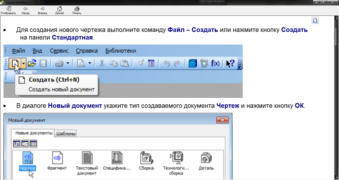 Стартовая страница системы КОМПАС 3D представляет собой ряд гиперссылок, позволяющих ознакомиться с новыми возможностями используемой версии программы, изучить краткие пособия по основам работы в редакторе твердотельного моделирования КОМПАС 3D и чертежно-графическом редакторе КОМПАС-График, перейти на сайты как самой компании АСКОН, так и программы КОМПАС 3D, посетить интернет-магазин АСКОН, а также воспользоваться услугами Службы поддержки. Создать новый документ можно через команду меню Файл Создать или кликом на значке Создать Стандартной панели инструментов (рис. 1.2)