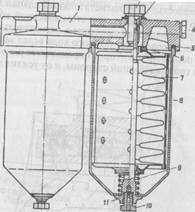 Рис.8.4. Фильтр тонкой очистки топлива: 1-корпус; 2-болт; 3-уплотнительная шайба; 4-пробка; 5 и 6-прокладки; 7-фильтрующий элемент; 8-колпак; 9-пружина фильтрующего элемента; 10-пробка сливного отверстия; 11-стержень Для повышения качества очистки топлива фильтр тонкой очистки снабжён двумя параллельно работающими сменными фильтрующими элементами, изготовленными из специальной бумаги и установленными в одном сдвоенном корпусе. Топливоподкачивающий насос низкого давления. Насос предназначен для подачи топлива из топливного бака к насосу высокого давления.. Топливоподкачивающий насос поршневого типа приводится в действие от эксцентрика кулачкового вала насоса высокого давления. Насос установлен на задней крышке регулятора. Схема работы насоса показана на рис. 8.6. При опускании толкателя поршень 10 под воздействием пружины 4 движется вниз. В полости " А" всасывания создается разряжение и впускной клапан 3, сжимая пружину 2, пропускает в полость топливо. Одновременно топливо, находящееся в нагнетательной полости " Б", вытесняется в магистраль, минуя нагнетательный клапан 8, соединенный каналами с обоими полостями. В свободном положении нагнетательный клапан закрывает канал всасывающей полости. При движении поршня 10 вверх топливо, заполнившее всасывающую полость, через нагнетательный клапан 8 поступает в полость " Б" под поршнем, при этом впускной клапан 3 закрывается. При повышении давления в нагнетательной магистрали поршень не совершает полного хода вслед за толкателем, а остается в положении, которое определяется равновесием сил от давления топлива с одной стороны, и от усилия пружины - с другой.