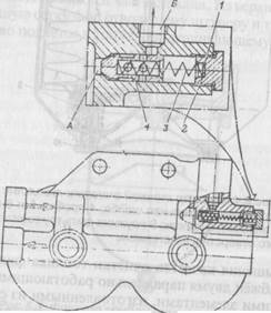 Рис.8.5.Клапан-жиклер фильтра тонкой очистки топлива: 1-регулировочная шайба; 2-пробка клапана; 3-пружина; 4-клапан-жиклер; А-полость нагнетания