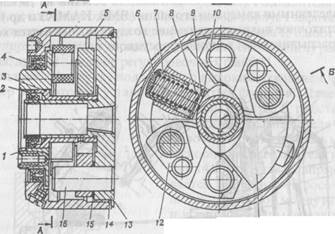 Рис.8.9. Схема изменения подачи топлива Изменение количества топлива, подаваемого секцией за один цикл, происходит в результате поворота плунжера 1 зубчатой рейкой. При различных углах поворота плунжера благодаря винтовой кромке смещаются моменты открытия выпускного отверстия. При этом, чем позднее открывается выпускное отверстие, тем большее количество топлива может быть подано к форсункам. На рис. 8.9 показаны следующие положения винтовой кромки плунжера за цикл работы топливной секции: - положение А - максимальная подача топлива и наибольший активный ход плунжера 1. В этом случае расстояние h от винтовой кромки 5 плунжера до выпускного отверстия 2 будет наибольшим; - положение Б - промежуточная подача, так как при повороте плунжера по часовой стрелке расстояние h уменьшается и выпускное отверстие открывается раньше; - положение В - нулевая подача топлива. Плунжер повёрнут так, что его продольный паз 3 расположен против выпускного отверстия 2 (h=0), в результате чего при перемещении плунжера вверх топливо вытесняется в выпускной канал, подача топлива прекращается и двигатель останавливается. Автоматическая муфта опережения впрыскивания топлива изменяет начало подачи топлива в зависимости от частоты вращения коленчатого вала двигателя. Применение муфты обеспечивает оптимальное для рабочего процесса начало подачи топлива по всему диапазону скоростных режимов. Этим обеспечивается экономичность и приемлемая жесткость процесса при различных скоростных режимах работы двигателя. Ведомая полумуфта 13 (рис.8.10) закреплена на конической поверхности переднего конца кулачкового вала топливного насоса шпонкой и гайкой с шайбой, ведущая полумуфта 1 - на ступице ведомой (может поворачиваться на ней). Между ступицей и полумуфтой установлена втулка 3. Грузы 11 качаются на осях 16, запрессованных в ведомую полумуфту, в плоскости, перпендикулярной оси вращения муфты. Проставка 12 ведущей полумуфты упирается одним концом в палец груза, другим - в профильный выступ. Пружина 8 стремится удержать груз на упоре во втулку 3 ведущей полумуфты. При увеличении частоты вращения коленчатого вала грузы под действием центробежных сил расходятся, вследствие чего ведомая полумуфта поворачивается относительно ведущей в направлении вращения кулачкового вала, что вызывает увеличение угла опережения впрыскивания топлива. При уменьшении частоты вращения коленчатого вала грузы под действием пружин сходятся, ведомая полумуфта поворачивается вместе с валом насоса в сторону, противоположную направлению вращения вала, что вызывает уменьшение угла опережения впрыскивания топлива