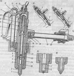 Рис. 8.11. Форсунка дизеля ЯМЗ (а); типы распылителей (6 и в) и схема работы форсунки (г) У штифтовых форсунок (рис. 8.11, б) на конце запорной иглы 2 имеется фасонный штифт, входящий в сопловое отверстие распылителя 1, что придает струе распыленного топлива конусообразность и строго определенную направленность. Такие форсунки чаще применяются на дизелях с разделенной камерой сгорания. На дизелях КАМАЗ-740 применяются форсунки закрытого типа с гидравлическим подъемом иглы и фиксированным распылителем. Все детали форсунки собраны в корпусе 6 (рис. 8.12). К нижнему торцу корпуса форсунки гайкой 2 присоединены проставки 3 и корпус 1 распылителя, внутри которого находится игла 14. Корпус и игла распылителя составляют прецизионную пару (индивидуально и с высокой точностью подобранные). Распылитель имеет четыре сопловых отверстия. Проставка 3 и корпус 1 зафиксированы относительно корпуса 6 штифтами 4. Пружина 13 одним концом упирается в штангу 5, которая передает усилие на иглу распылителя, другим - в набор регулировочных шайб 11. Топливо к форсунке подается под высоким давлением через штуцер 8, в котором установлен сетчатый фильтр 9. Далее по