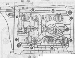 32 31 30 29 28 27 26 25 Рис.8.13.Регулятор частоты вращения: 7-задняя крышка; 2-гаика; 3-шайба; 4-подшипник; 5-регулировочная прокладка; 6-промежуточная шестерня; 7-прокладка задней крышки регулятора; 8-стопорное кольцо; 9-державка грузов; 10-ось груза; 11-упорный подшипник; 12-муфта; 13-груз; 14-палец; 15-корректор; 16-возвратная пружина рычага останова; 17-болт; 18-втулка; 19-кольцо; 20-рычаг пружины регулятора; 21-ведущая шестерня; 22-сухарь ведущей шестерни; 23-фланец ведущей шестерни; 24-регулировочный болт подачи топлива; 25-рычаг стартовой пружины; 26-пружина регулятора; 27-рейка; 28-стар-товая пружина; 29-штифт; 30-рычаг реек; 31-рычаг регулятора; 32-ры-чаг муфты грузов; 33-ось рычагов регулятора; 34-болт крепления верхней крышки