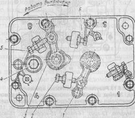 Рычаг 1 (рис. 8.14) управления регулятором жестко связан с рычагом 20 (рис. 8.13). К рычагам 20 и 31 присоединена пружина 26; к рычагам 25 и 30 - стартовая пружина 28. Во время работы регулятора в определенном режиме центробежные силы грузов уравновешенны усилием пружины 26. При увеличении частоты вращения коленчатого вала грузы, преодолевая сопротивление пружины 26, перемещают рычаг 32 регулятора с рейкой топливного насоса - подача топлива уменьшается. При уменьшении частоты вращения коленчатого вала центробежная сила грузов уменьшается и рычаг 32 регулятора с рейкой топливного насоса под действием усилия пружины перемещается в обратном направлении - подача топлива и частота вращения увеличиваются. Подача топлива выключается поворотом рычага 3 (рис. 8.14) останова до упора в болт 6, при этом рычаг 3, преодолев усилие пружины 26 (рис. 8.13) через штифт 29 повернет рычаги 31 и 32; рейка переместится до полного выключения подачи топлива. При снятии усилия с рычага останова под действием пружины 16 рычаг возвратится в рабочее положение, а стартовая пружина 28 через рычаг 30 вернет рейку топливного насоса в положение максимальной подачи топлива, необходимой для пуска.