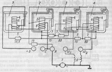 Рис. 11.9. Электрическая схема реле-регулятора РР-51 и генератора Г-51: 1-реле обратного тока; 2-ограничитель тока; 3-первый регулятор напряжения; 4-второй регулятор напряжения; 5-сопротивления; 6-обмотка возбуждения генератора; 7-генератор; а-параллельная обмотка; б-ускоряющая обмотка; в-последовательная обмотка; г-компенсирующая обмотка С увеличением частоты вращения ротора генератора, когда напряжение генератора достигает 13, 9-14, 6 В, стабилитрон Д] пробивается, транзистор Т, открывается, а транзисторы Т2 и Т3 закрываются. В этом случае ток в обмотку возбуждения генератора поступает только через добавочный резистор R8, и, естественно, уменьшается напряжение генератора до момента закрытия стабилитрона Д,. С закрытием стабилитрона ток в обмотку возбуждения поступает через открытый транзистор Т3. Напряжение генератора начнет возрастать до следующего открытия стабилитрона Д,