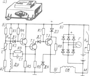 Рис. 11.10. Схема бесконтактного транзисторного реле-регулятора РР-350 а) общий вид б) электрическая схема Остальные элементы схемы выполняют вспомогательные функции, необходимые для более четкой и надежной работы прибора. Принцип действия остальных бесконтактных транзисторных реле-регуляторов аналогичен описанному. Например, реле-регулятор РР-356 рассчитан на работу с генератором номинальным напряжением 24 В и имеет два стабилитрона и два более мощных транзистора. В последние годы получили широкое распространение генераторы с встроенными транзисторными регуляторами напряжения на интегральных схемах (Я П2А, Я 120, 11.3702) которые имеют значительно меньшие габариты и вес (38x58x12 мм, масса 50 г). Эти регуляторы монтируют на задней крышке генератора. Принцип работы этих регуляторов аналогичен работе регулятора РР-350 А. При напряжении на клеммах генератора меньше предельного транзистор, включенный последовательно с обмоткой возбуждения генератора, открыт и пропускает ток возбуждения. Если напряжение превышает предельное значе- ние, то транзистор закрывается и резко изменяется сила тока в обмотке возбуждения генератора. Этот процесс происходит с большой частотой и практически напряжение генератора остается постоянным. Интегральный регулятор напряжения-изделие неразборное и неремонтируемое. Напряжение регулятора регулируют на заводе-изготовителе. Регулятор такого типа 11.3702, работающий совместно с генератором Г 288Е, установлен на автомобиле КАМАЗ-4310, поэтому при его эксплуатации запрещается: - работа генераторной установки с отключенной аккумуляторной батареей (отключенной «массе»); - пуск двигателя при отключенном плюсовом проводе генератора; - проверка исправности генераторной установки на «искру» замыканием любых зажимов генератора и щеткодержателя; - соединение зажима «Ш» с зажимами «+» и «В» генератора (это ведет к мгновенному отказу в работе генератора); - проверка исправности схемы электрооборудования с номинальным напряжением 12 В от источника тока с напряжением выше 16 В, а для схем с напряжением 24 В выше 36 В. Совместная работа генераторной установки и аккумуляторной батареи. Генераторная установка и батарея включены параллельно (рис. 11, И) и дополняют друг друга, обеспечивая приемники электрической энергией. При неработающем генераторе 6 или когда его напряжение меньше э.д.с. батареи 2 все приемники 5 питаются только от батареи 2, ток которой регистрируется амперметром 4. Ток стартера 3 амперметр не регистрирует так же, как и не регистрирует ток генератора, идущий на приемники. Когда напряжение генератора превысит э.д.с. батареи, происходит перераспределение электрической энергии, отдаваемой генератором, он начинает питать приемники и заряжать батарею.