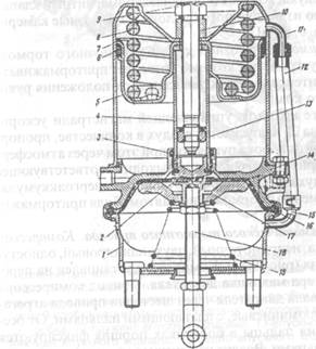 Рис. 19.12. Тормозная камера типа 24/24 с пружинным энергоаккумулятором: 1-корпус тормозной камеры; 2-подпятник; 3-уплотнительное кольцо; 4-толкатель- 5-поршень; 6-уплотнение поршня; 7-цилиндр энергоаккумуля тора- 8-силовая пружина; 9-винт механизма аварийного растормаживания; 10-упорная гайка; 11-патрубок цилиндра; 12-дренажная трубка; 13-упор-ный подшипник; 14-фланец; 15-патрубок тормозной камеры; 16-диафраг-ма тормозной камеры; 17-опорный диск; 18-шток; 19-возвратная пружина 23. Зак.33