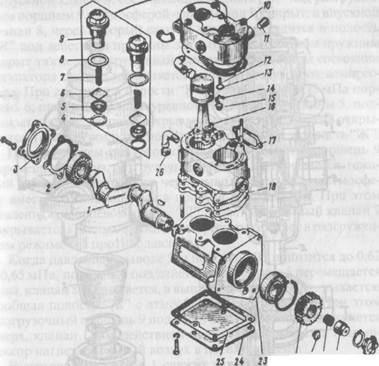 Рис. 19.13.Компрессор: 1-коленчатый вал; 2-подшипник; 3-задняя крышка картера; 4-прокладка седла; 5-седло нагнетательного клапана; 6-нагнетательный клапан; 7-пру-жина нагнетательного клапана; 8-прокладка пробки нагнетательного клапана; 9-пробка нагнетательного клапана; 10-головка компрессора в сборе; 11-пробка; 12-пружина впускного клапана; 13-впускной клапан; 14-направ-ляющая впускного клапана; 15-седло впускного клапана; 16-поршень с шатуном в сборе; 17-прокладка патрубка; 18-пластина отражателя; 19-уп-лотнитель; 20-пружина уплотнителя; 21-пробка; 22-шестерня привода; 23-картер; 24-нижняя крышка картера; 25-прокладка; 26-колпачок При достижении в пневмосистеме давления 0, 70 -0, 75 мПа регулятор давления сообщает нагнетательную магистраль с атмосферой, прекращая тем самым подачу воздуха в пневмосистему. Когда давление воздуха в пневмосистеме снизится до 0, 62 -0, 65мПа, регулятор перекрывает выход воздуха в атмосферу и компрессор снова начинает подавать воздух в пневмосистему. Регулятор давления (рис 19.14) предназначен для регулирования давления сжатого воздуха, поступающего от компрессора. Сжатый воздух от компрессора через ввод ІV регулятора, фильтр 2, канал «Е» подается в кольцевой канал «Д». через обратный клапан 7 сжатый воздух поступает к выводу ІІ и далее в рессиверы пневмосистемы автомобиля. Одновременно по каналу " Г" сжатый воздух проходит в полость " В" под поршень 6, который нагружен уравновешивающей пружиной 5. При этом выпускной клапан 4. соединяющий полость " Ж" над разгрузочным поршнем 9 с атмосферой через вывод I, открыт, а впускной клапан 8, через который сжатый воздух подводится в полость " Ж" под действием пружины закрыт. Под действием пружины закрыт также и разгрузочный клапан 1. При таком состоянии регулятора система наполняется сжатым воздухом от компрессора. При давлении в полости " В", равном 0, 70 - 0, 75 мПа поршень 6, преодолев усилие уравновешивающей пружины 5, поднимается вверх, клапан 4 закрывается, впускной клапан 8 открывается и сжатый воздух из полости " В" поступает в полость " Ж". Под действием сжатого воздуха разгрузочный поршень 9 перемещается вниз, разгрузочный клапан 1, открывается и сжатый воздух из компрессора через вывод III выходит в атмосферу вместе со скопившимся в полости конденсатом. При этом давление в кольцевом канале " Д" падает и обратный клапан 7 закрывается. Таким образом, компрессор работает в разгруженном режиме без противодавления. Когда давление в выводе II и полости " В" понизится до 0, 62 - 0, 65 мПа, поршень 6 под действием пружины 5 перемещается вниз, клапан 8 закрывается, а выпускной клапан 4 открывается, сообщая полость " Ж" с атмосферой через вывод I. При этом разгрузочный поршень 9 под действием пружины поднимается вверх, клапан 1 под действием пружины закрывается и компрессор нагнетает сжатый воздух в пневмосистему. Разгрузочный клапан 1 служит также предохранительным клапаном. Если регулятор не срабатывает при давлении 0, 70-0, 75 мПа, то при повышении давления до 1, 00 - 1, 30 мПа клапан 1 открывается, преодолев сопротивление своей пружины и пружины поршня 9. Для присоединения специальных устройств регулятор давления имеет вывод, который соединен с вводом IV через фильтр 2. Этот вывод закрыт резьбовой пробкой 3. Кроме того, предусмотрен клапан отбора воздуха для накачки шин, который закрыт колпачком. При навинчивании штуцера шланга для н