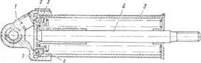 Рис. 19.24 пневматический цилиндр привода заслонки механизма вспомогательного тормоза: 1-крышка; 2-поршень; 3 и 6-вовратные пружины; 4-шток; 5-корпус; 7-манжета Пневматический цилиндр 35x65 мм шарнирно закреплен на кронштейне с помощью пальца. Шток цилиндра резьбовой вилкой соединяется с рычагом управления заслонкой. При включении вспомогательного тормоза сжатый воздух от пневматического крана через ввод в крышке 1 (рис. 19.24) поступает в полость под поршнем 2. Поршень 2, преодолевая силу возвратных пружин 3 и 6, перемещается и воздействует через шток 4 на рычаг управления заслонкой вспомогательного тормоза, переводя заслонку из положения «Открыто» в положение-«3акры-то». При выпуске сжатого воздуха поршень 2 со штоком 4 под действием пружин 3 и 6 возвращается в исходное положение. При этом заслонка поворачивается в положение «Открыто». Пневматический цилиндр 30x25 мм шарнирно установлен на крышке регулятора топливного насоса высокого давления. Шток цилиндра резьбовой вилкой соединен с рычагом регулятора. При включении вспомогательного тормоза сжатый воздух от пневматического крана через ввод в крышке 1 (рис. 19.25) цилиндра поступает в полость под поршнем 2. Поршень 2, преодолевая силу возвратной пружины 3, перемещается и воздействует через шток 4 на рычаг регулятора топливного насоса, переводя его в положение нулевой подачи. При выпуске сжатого воздуха поршень 2 со штоком 4 под действием пружины 3 возвращается в исходное положение