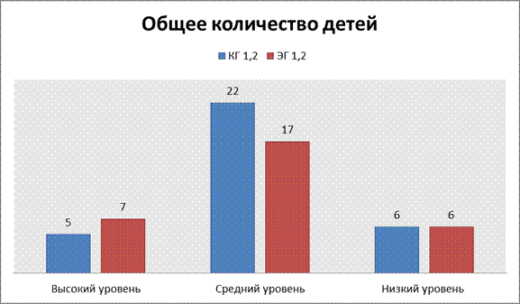 Качественный анализ полученных результатов показал, что дети старшего дошкольного возраста достаточно хорошо владеют знаниями и представлениями о разных профессиях взрослых: знают названия разных профессий, называют орудия труда, результат трудовой деятельности взрослых. Однако достаточного интереса к трудовой деятельности взрослых не проявляют. Это определяются тем, что дети не интересуются процессом трудовой деятельности, не определяют социальную значимость той или иной профессии, не используют в игровой деятельности. Для выделения направлений формирующего эксперимента мы определили средний уровень сформированности представлений о труде взрослых как среднее значение по трём методикам. Результаты получились следующие: высокий уровень в экспериментальной группе показали 7 детей (11%), средний —17 (27%)детей, низкий 6 (9%) ребёнка. В контрольной группе результаты следующие: высокий уровень имеют 5(8%) детей, средний уровень — 22 (34%) ребёнка, низкий — 6 (9%) ребёнка (Рисунок 2.1).