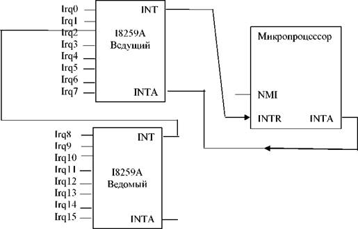 d 0- d7- выводы i 8259А замыкающиеся на системную шину данных. INT- вывод выходного сигнала запроса на прерывание, который подается на вход микропроцессора INTR. INTA- вывод для сигнала от микропроцессора подтверждающего факт принятия им прерывания на обслуживания irgo... irgf Irg0- irg 7- выводы для входных сигналов запросов на прерывания от внешних устройств. На рисунке 8 представлена схема приоритетов аппаратных прерываний АТ-совместимых компьютеров.
