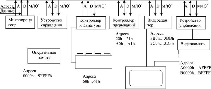 Система ввода - вывода, т. е. комплекс средств обмена информации с внешними устройствами включает: - способы подключения к системной шине различного оборудования; - процедуры взаимодействия процессора с этим оборудованием; - команды процессора, предназначенные для обмена данными с внешними устройствами. Непрерывное совершенствование микропроцессоров и стремление максимально повысить производительность всей вычислительной системы привело к существенному изменению внутренней организации компьютеров, повышению разрядности шин, появлению внутренних быстродействующих магистралей обмена данными, использованию КЭШ - буферов для ускорения обмена с памятью, дисками и программами. Если отвлечься от деталей важных с точки зрения производительности, то логическую схему современного компьютера можно представить традиционным образом, в виде системной шины (магистрали), к которой подключается сам микропроцессор и все устройства компьютера. Процессор связан с системной шиной большим количеством линий. Из них (в системе ввода-вывода): А - набор линий адресов, D - набор линий данных, M / IO (M - IO с отрицанием). За каждым устройством закреплена определенная группа адресов, на которые он должен отзываться. Обнаружив свой адрес на магистрали, устройство, в зависимости от заданного направления передачи данных, либо считывает с магистрали поступившие данные, либо наоборот, устанавливает имеющиеся в нем данные на магистраль. На рисунке 9 представлено подключение устройств компьютера к системной шине