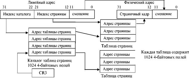 Рисунок 12. Цепочка преобразований виртуального адреса в физический. Страницей называется связный участок линейного или физического адресного пространства объемом 4 Кбайт. Механизм страничной трансляции отображает логические страницы на физические в соответствии с информацией, содержащейся в страничных таблицах. Система страничных таблиц состоит из двух уровней. На первом уровне находится каталог таблиц страниц (или просто каталог страниц) — резидентная в памяти таблица, содержащая 1024 4х-байтовых поля с адресами таблиц страниц. На втором уровне находятся таблицы страниц, каждая из которых содержит так же 1024 4х-байтовых поля с адресами физических страниц памяти. Максимально возможное число таблиц страниц определяется числом полей в каталоге и может доходить до 1024. Поскольку размер страницы составляет 4 Кбайт, 1024 таблицы по 1024 страницы перекрывают все адресное пространство (4 Гбайт). На рисунке 13 представлена схема страничной трансляции адресов.