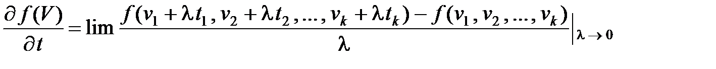 Пусть в Ek заданы некоторая точка V = (v 1, v 2, …, vk), единичный вектор t и непрерывно дифференцируемая по всем аргументам функция f (V) = f (v 1, v 2, …, vk). Производной в точке V от функции f (V) по направлению луча, определяемому вектором t, называется предел