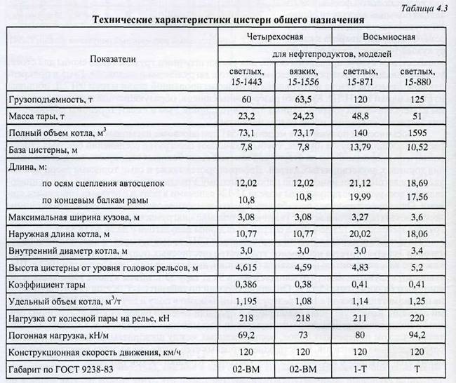 Цистерны предназначены для перевозки жидких, газообразных, затвердевающих и порошкообразных грузов. Они различаются по роду перевозимых грузов, конструкции рамы, осности и калибровочному типу. Перевозимые грузы размещаются в котле, представляющем собой специфическую форму кузова. Универсальные цистерны подразделяются на цистерны для перевозки светлых (бензин, керосин, лигроин и т.п.) и темных (нефть, минеральные масла и т.п.) наливных грузов. Все универсальные цистерны железных дорог России оборудованы нижними сливными приборами, обеспечивающими надежную герметичность затворов. Массу жидкого груза, перевозимого в цистернах, определяют замерно-калибровочным способом, при котором измеряют высоту наполнения котла, учитывают плотность груза и затем по специальным калибровочным таблицам, в которых приведена емкость котлов в зависимости от уровня его налива, подсчитывают массу груза. Калибровочный тип цистерны обозначен в виде металлических цифр, приваренных к котлу на обеих сторонах его цилиндрической части. В зависимости от устройства несущих элементов цистерны разделяются на конструкции, в которых все основные нагрузки, действующие на цистерну, воспринимаются рамой котла, и конструкции, в которых эти нагрузки воспринимаются котлом (безрамные цистерны). Кроме того, цистерны различаются по осности, грузоподъемности, объему котла, устройству, материалу и способу изготовления котла. Основные технические характеристики универсальных цистерн общего назначения приведены в табл. 4.3.